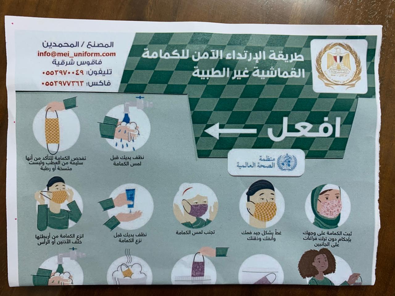 وأكدت أن الكمامات مدون عليها مجموعة من الإرشادات العامة لكيفية الإستخدام ومنها أن يبدأ استخدامها للمرة الأولى بعد غسلها ويتم غسلها بطريقة منفردة تحت درجة حرارة 60 درجة مئوية، ثم تعريضها لأشعة الشمس حتى تجف ويمنع لمس الطبقة الخارجية لها.