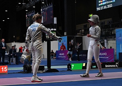 ورفعت خارلان نصل سيفها بدلا من ذلك، ودعت سميرنوفا للنقر عليه، وهي لفتة حلت محل المصافحة أثناء جائحة كوفيد 19 ويجب أن تكون كافية. واختارت سميرنوفا، التي يبدو أنها تدعم العملية العسكرية الروسية في الصور، تحويل الوضع إلى مسرح. وبقيت في الحلبة لمدة 45 دقيقة وجلست في النهاية على كرسي مخصص لها. وأعجب الاتحاد الدولي للمبارزة بذلك حيث استبعد خارلان، وتقدمت سميرنوفا إلى الجولة التالية.