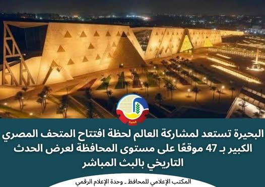 في مشهد وطني مهيب يعكس روح الانتماء والفخر بالحضارة المصرية العريقة، تستعد محافظة البحيرة لتعيش واحدة من أعظم اللحظات في تاريخ مصر الحديث، حيث تتجه أنظار العالم إلى افتتاح المتحف المصري الكبير، أيقونة المجد المصري وبوابة الحضارة إلى المستقبل.