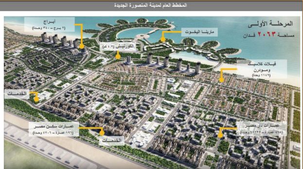 ونفـذت مدينة المنصورة الجديـدة، علـى 4 مراحل، حيث بلغت مساحة المرحلة الأولى حوالى 2063 فدانا، باستثمارات قدرة بنحو 22 مليار جنيه.