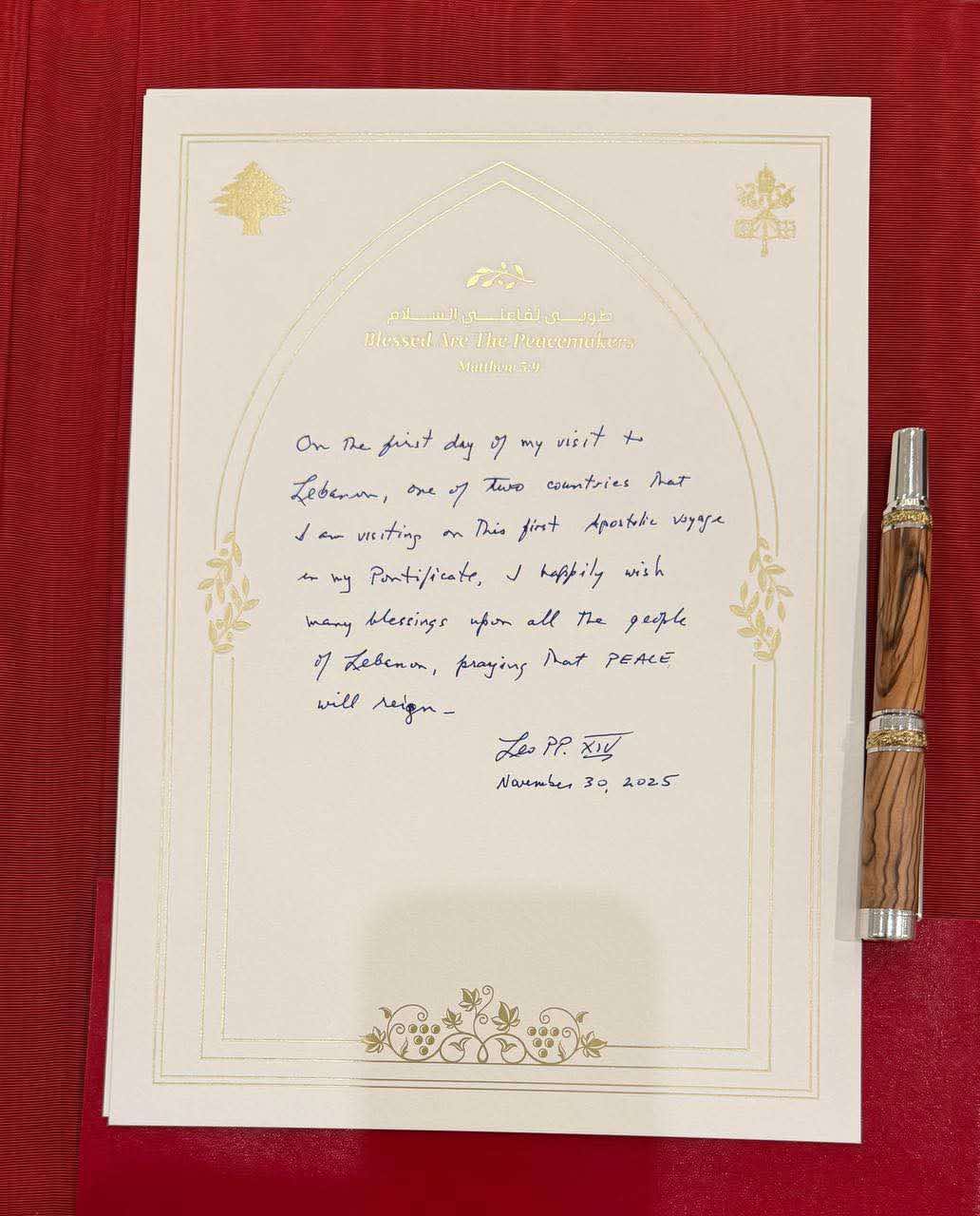 في لفتة مؤثرة، خطَّ البابا لاوُن الرابع عشر بابا الفاتيكان بيده رسالة في سجل الشرف بالقصر الجمهوري اللبناني، في أولى محطات زيارته الرسولية.