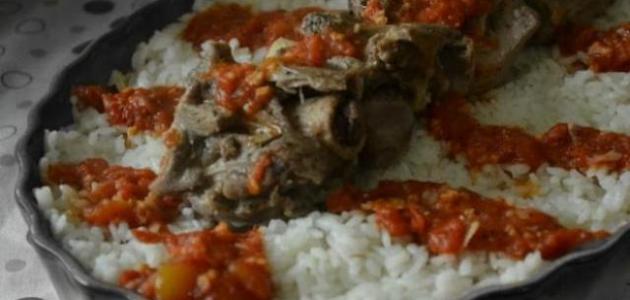 4- إضافة الصلصة على السمن والثوم والقليل من شوربة اللحمة وتترك حتى يصبح قوامها سميك ويضاف لها الملح والفلفل الأسود، بعد الانتهاء من تسوية كل الطعام يوضع الخبز المقطع مع قليل من الصلصة في صينية التقديم ثم الأرز ثم يوضع الصلصة فوق الصينية بأكملها مع وضع قطع لحم.