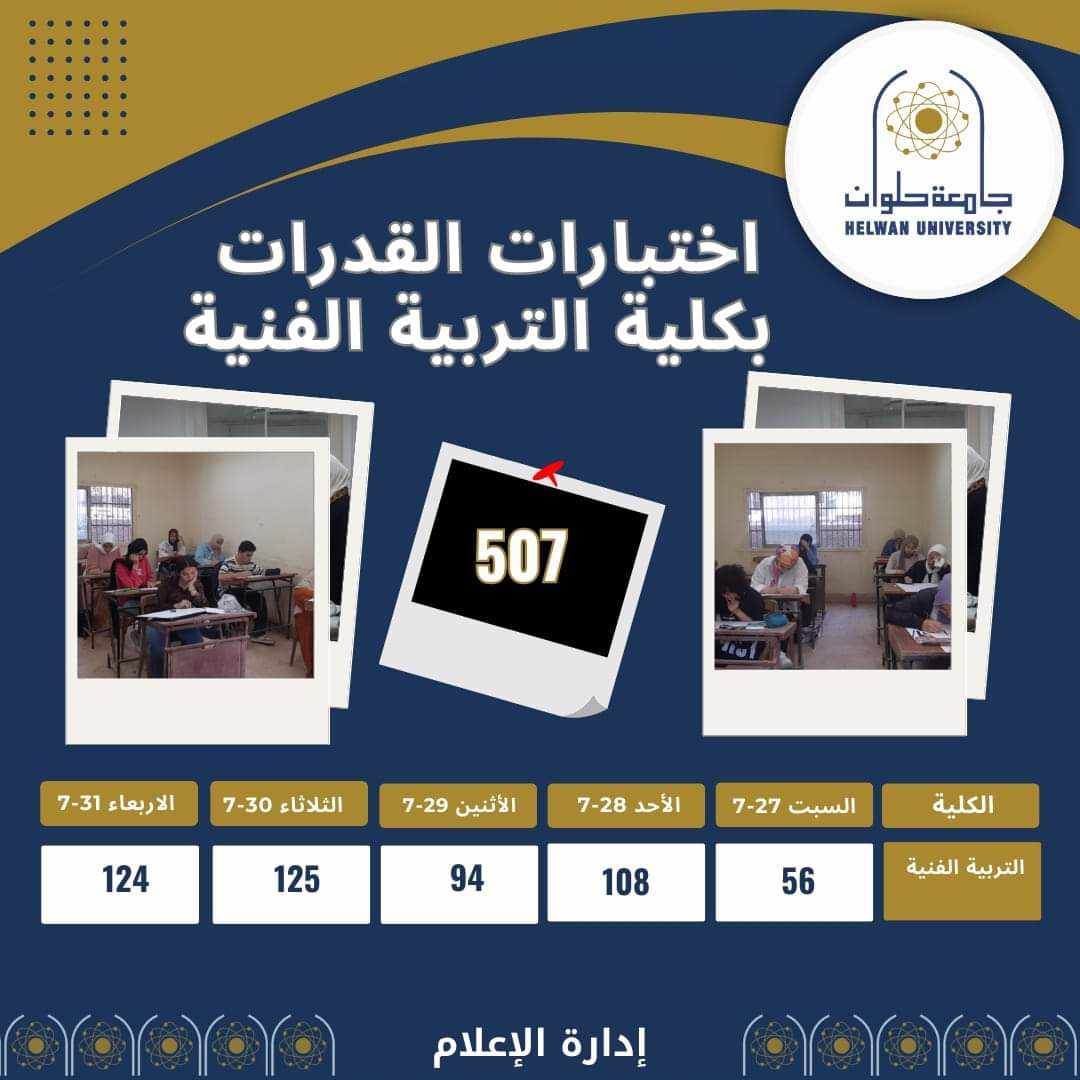 استقبلت كلية التربية الفنية بجامعة حلوان اليوم 124 طالبًا وطالبة لإجراء اختبارات القدرات للعام الدراسي الجديد. وبهذا، يرتفع إجمالي عدد الطلاب الذين أدوا اختبارات القدرات حتى اليوم إلى 507 طالب وطالبة.